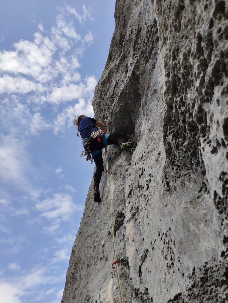 La suite de la grande voie est impressionnante. J’avance la peur au ventre. Je visualise ma chute. C’est le moment que choisit ma jambe pour apprendre à danser le twist en autodidacte. Qu’est-ce que je fous là putain ?