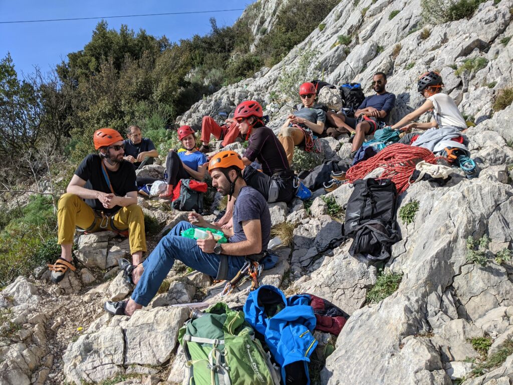 Et puis ça y est : Comme à chaque fois, la magie de l’escalade pointe le bout de son baudrier. Les topos passent de main en main. On évoque la longueur de nos cordes, on se lance dans le jeu graveleux du « Titre », on se montre les secteurs qu’on connaît, et ceux qu’on veut découvrir à tout prix. On parle des manips de secours – qu’on ne connait toujours pas très bien – on remarque les nouvelles cordes des uns, les casques en polystyrène plus légers des autres…