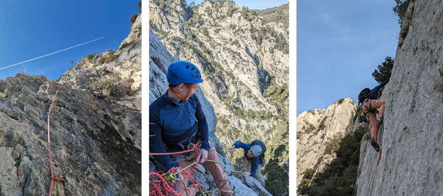 Louis and Louen were to take me and Gustavo on our first double rappel, to enter the crag of Capri. I was hesitant to do this because of all the horror stories, but alas, I knew we were in good hands and it went magnificently. Gustavo and I were to embark on our first solo multipitch together, the 4-pitch 5c “Turkish Delight.” And a delight it was! Louis and Louen had a mission to do 2 separate multipitches at Capri, both around 6a+.