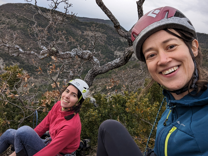 Après 1h30 de voiture et quelques victuailles avalées en vitesse, place à la pratique. Les uns se dégourdissent les jambes dans la grande voie « Le maître de la danse », tandis que d’autres partent à la découverte du secteur « 4 heures » pour quelques jolies premières longueurs. Pour Cathy, Pauline et Julie, c’est même la découverte des joies de la falaise… François en profite pour leur partager quelques conseils et son émerveillement de l'odeur du buis (qui pour moi sent le pipi de chat, mais bon!).