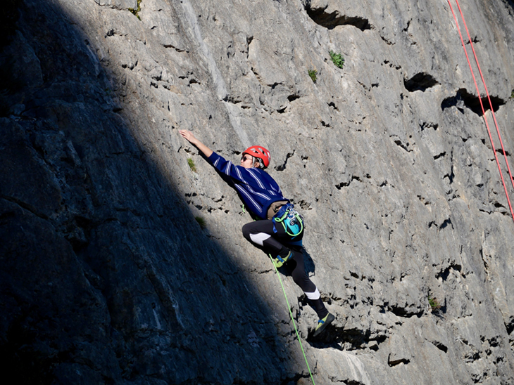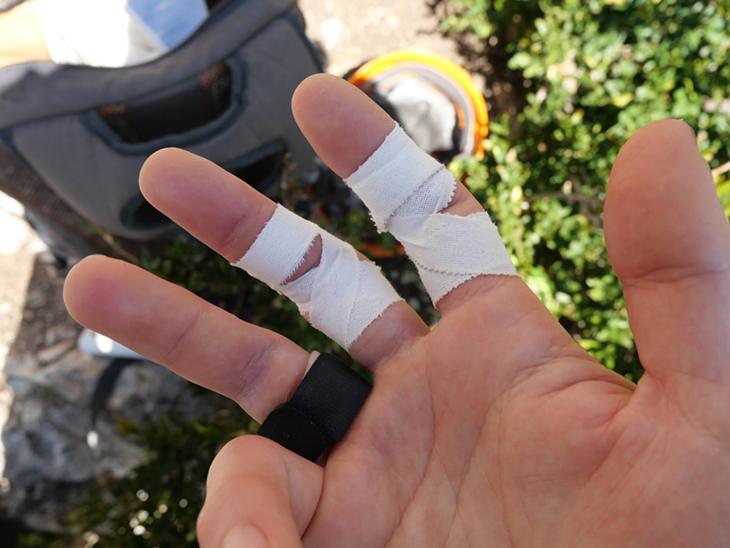 Le séjour est aussi marqué par Pierre, l’un des deux co-organisateurs, cloué au sol par une méchante poulie (partielle). Pierre en profite pour expérimenter la grimpe en second à trois doigts, faire une boucle de randonnée de 18 kilomètres dans les environs, mais aussi de délicieuses pâtes à la bolognaise végétariennes. Eh oui, dans toutes les conditions, le grimpeur sait s’adapter, garder le sourire et participer à la vie commune de la troupe… C’est l’esprit de la FSGT !