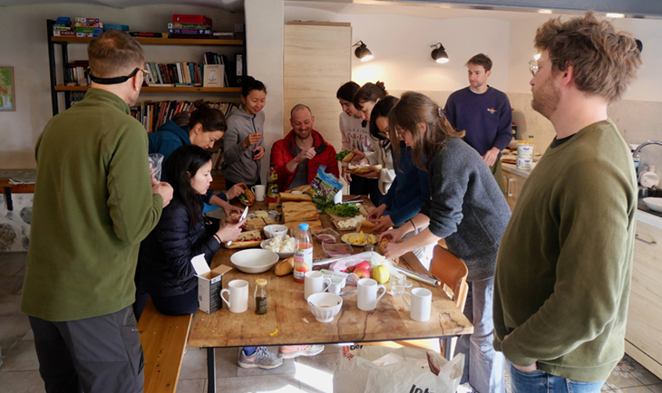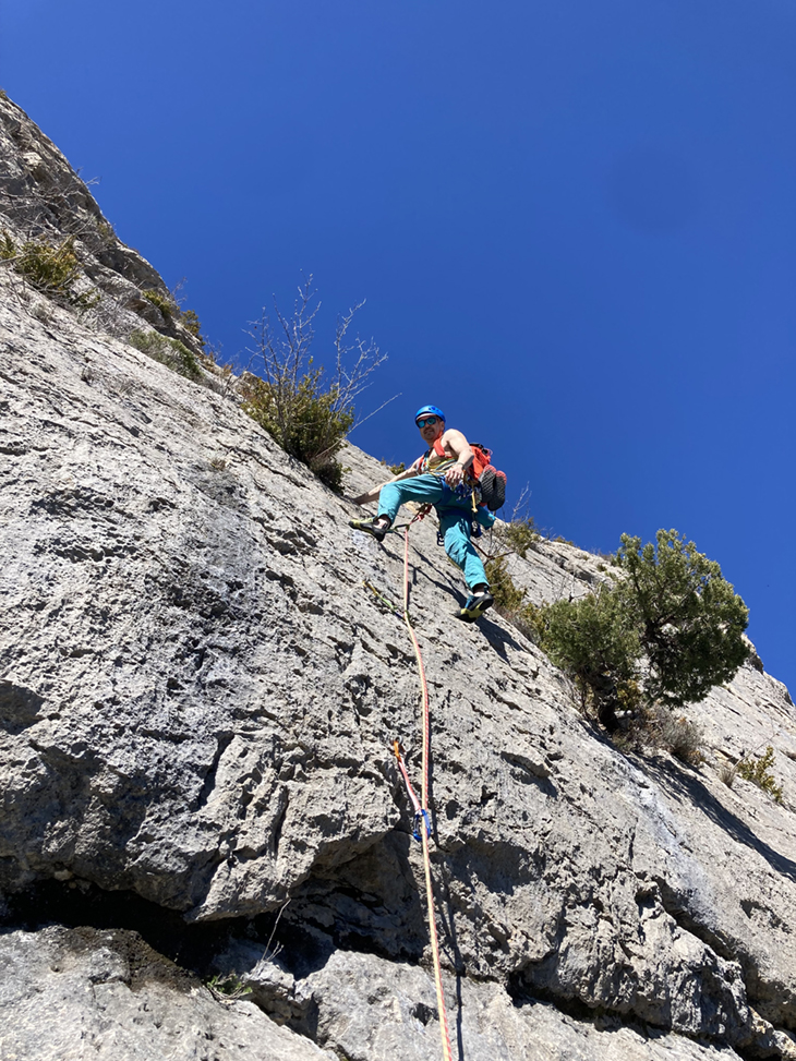 Le soleil est au rendez-vous et se prolongera (presque) durant tout notre séjour. Dès le 2e jour, Matthieu a d’ailleurs décidé d’en profiter et effectue la dernière longueur de « La grotte » torse nu ! Photo à l’appui ! D’autres partent sur « Le Dièdre sud » ou « Brazil », et tous reviennent avec des couleurs, voire des coups de soleil ! Le soir, grande tablée et discussions autour de petits fromages du coin… Une mention spéciale est décernée aux recettes de sandwichs du midi de Youssef, concoctées grâce à… ChatGPT !