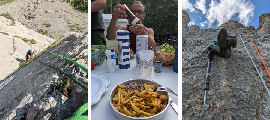• Prendre des forces avant un gros projet avec un bon steack frites, grace à Peter et ses fils (C19) (“on mange beaucoup de patates comme on est Allemands”) et à Alex (Roc14), végétarien emmené à la boucherie de l’Argentière pour qu’il fasse le plein de fromage (normal) puis récupérer avec un délicieux dahl, grace aux lémurien·ne·s (les autres, ceux avec les beaux T-shirt).
