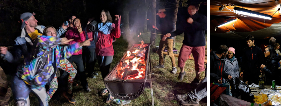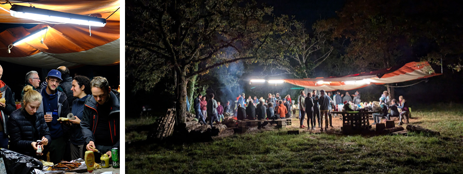 Une fois cette première journée bien remplie terminée, on retourne au camp pour un apéro légendaire offert par la municipalité de Hauteroche, le tout accompagné d’un magnifique coucher de soleil. C’est un grand moment de partage où chacun·e se retrouve autour de quelques verres et de nombreuses anecdotes, dans une ambiance qui monte en intensité jusqu’à tard dans la nuit. Certain·e·s ne rejoignent d’ailleurs leur tente qu’à 3h du matin, défiant le sommeil et refusant de laisser la fête se terminer !