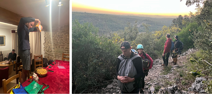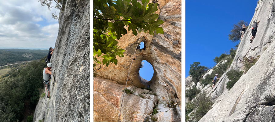 Fabienne a dû télétravailler le premier jour. Elle a pu profiter de la terrasse ensoleillée du gîte. Le séjour étant sur cinq jours, elle a quand même eu quatre journées de grimpe. Après une longue pause d’activité, elle a renoué avec le plaisir de la falaise, encouragée par ses binômes pour parvenir à sortir plusieurs voies en tête.