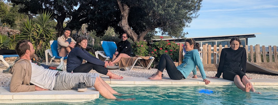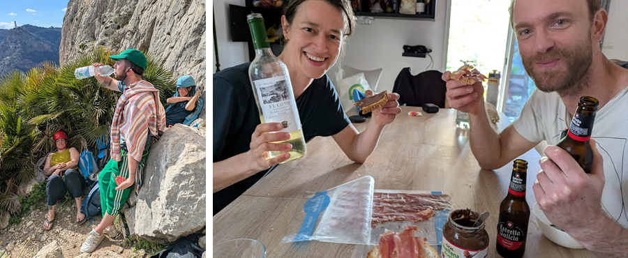 Mercredi, après une bonne session grimpe, “certains” se tapent un casse croute post grimpe digne d’une bonne grosse foncedalle… même si Lo – notre gars sûr – n’avait rien à dealer au pied de la falaise, une plaquette d’iberico y passe (au goûter entre 2 tartines de nutella ça marche aussi), tant pis s’il y a plus de soleil quand on arrive à la piscine… et ça n’empêchera personne d’apprécier le risotto de Michael et les bananes flambées – glace vanille – supplément chocolat.