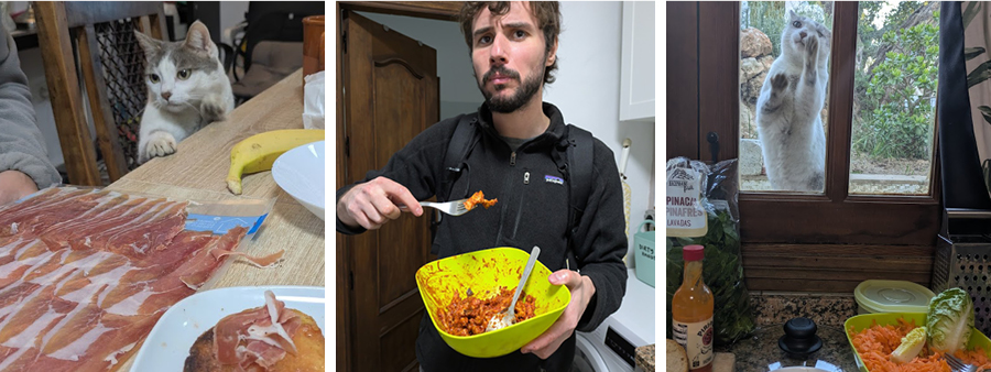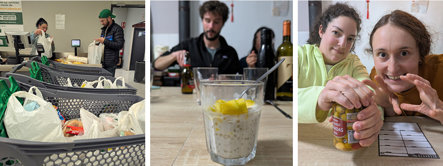 Souffrant toujours de PTSD depuis la première session courses après un lever à 4h30 du mat avec 200 items à trouver dans un magasin au rayonnage random (j'ai trouvé la confiture ! c'est entre le poulet et les pâtes), Nina cède la place à Delphine pour accompagner Laurent pour le refill. Il est pote avec tout le staff depuis qu’il a du leur demander ou se trouvaient les items de la moitié de la liste lors des premières courses, la mission est gérée de main de maître… Pendant que ça geek dans l’open space de la maison haute, on s’affaire dans la maison du bas pour rester dans la thématique exotique et préparer curry de légumes, Ché Chuoi Andalou (aux mangues de saison du Brésil 😐 ) pour le diner et banh-mi au piri piri pour le déj du lendemain tout en déglinguant les meilleures olives marinées du mercadona.